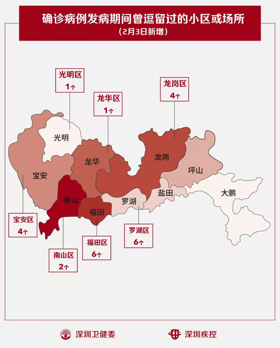 2月3日,疾控專業(yè)人員通過最新的流行病學(xué)調(diào)查確認(rèn),深圳新增24個小區(qū)(場所),有新確診的病人在出現(xiàn)病征期間曾經(jīng)逗留。