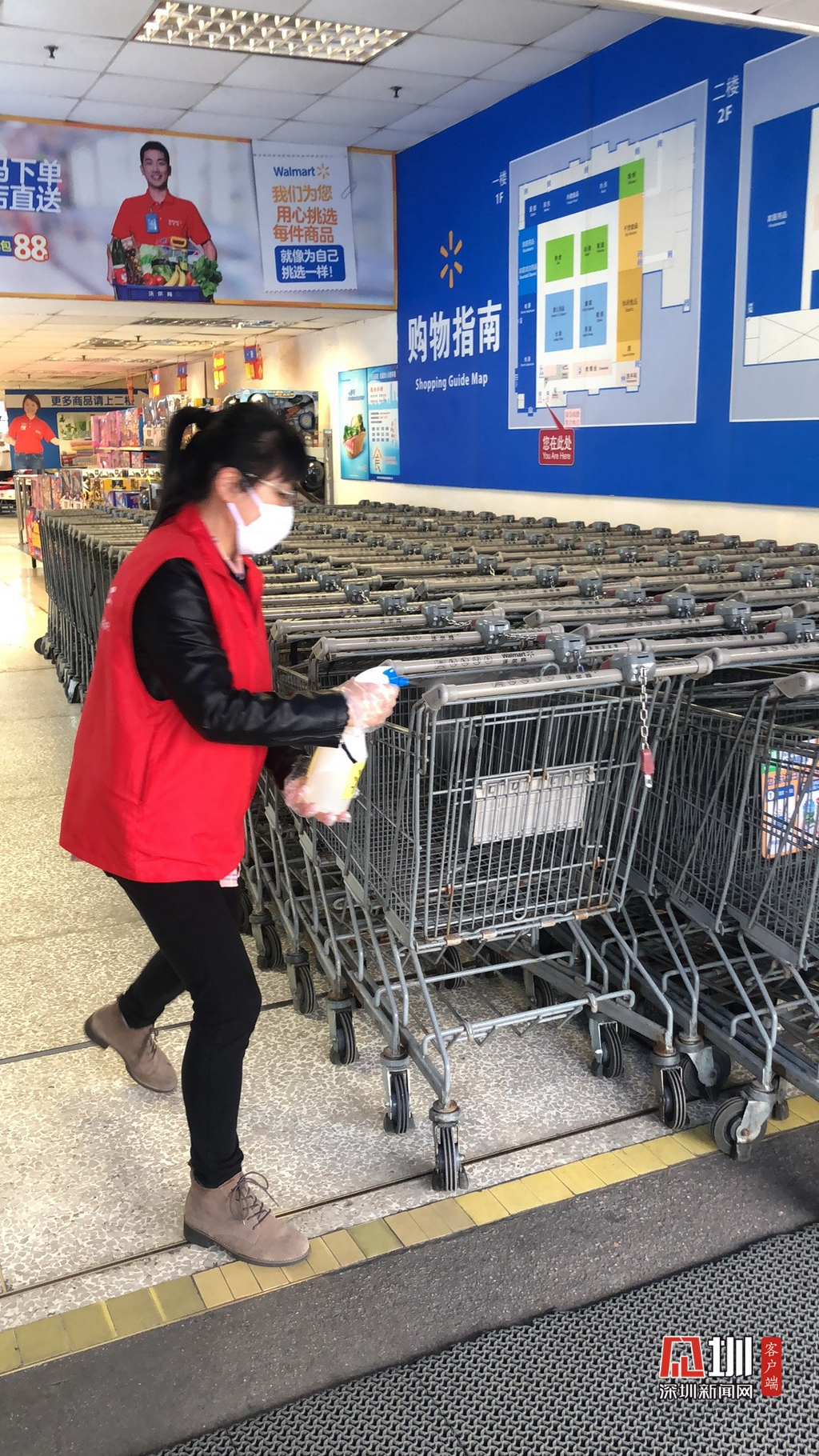 在消毒方面,景田北沃爾瑪超市每天對(duì)超市進(jìn)行高頻次消毒,包括購(gòu)物車(chē)、按鍵、門(mén)把手、出入口等人群經(jīng)常接觸的區(qū)域,并保持場(chǎng)所通風(fēng),增加空氣對(duì)流。