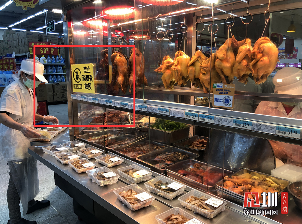 超市熟食區(qū)有明顯禁止消費(fèi)者觸摸等標(biāo)志。