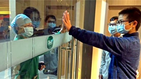 自從媽媽去忙工作,就沒有再見到媽媽了,他有太多話想說,也許是他們的執(zhí)著,也許運(yùn)氣,剛好碰到飯點(diǎn)時(shí)間,吳玉娟正好下來幫忙搬運(yùn)晚飯,雖然只能隔著玻璃和媽媽聊天,玻璃是冰冷的,但此刻他們的心是相連的、是溫暖的。“媽媽,你是我的驕傲,請(qǐng)你安心工作,我們期待你回來。”