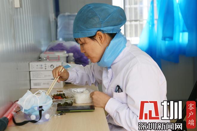 晏醫(yī)生在臨時(shí)休息室內(nèi)吃盒飯。