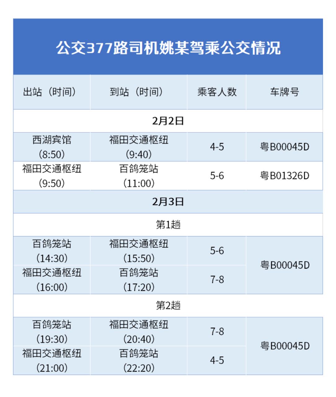 根據(jù)姚某的行車記錄,2月2日早上8時(shí)50分,他隨377路跟班一趟,從西湖賓館站至福田交通樞紐,又從該站換車至百鴿籠站,每一輛公交車的乘客人數(shù)為4-6人。跟班時(shí),姚某多數(shù)時(shí)間坐在公交車中后部,并佩戴口罩。