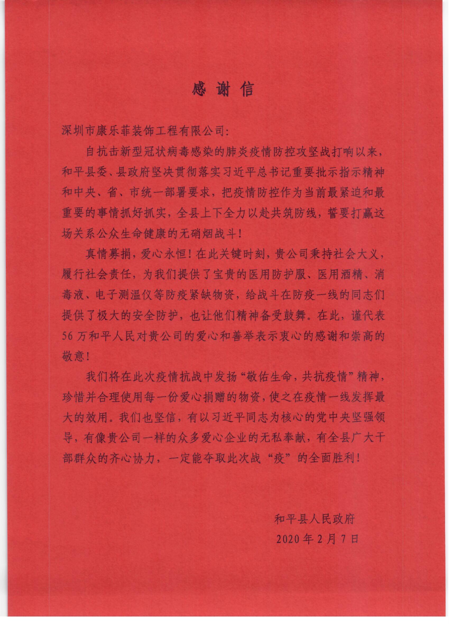 和平縣人民政府向愛心企業(yè)送上的感謝信