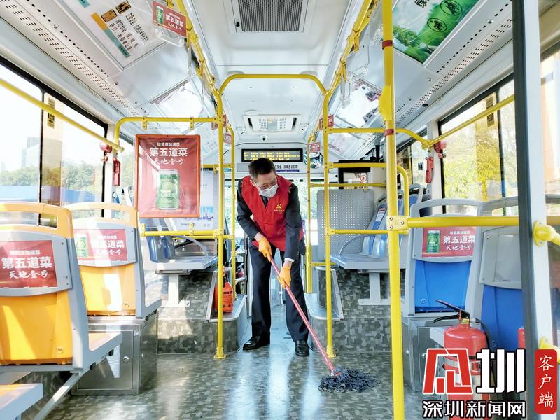 深圳巴士集團四分公司工作人員對公交車進行消毒擦洗。