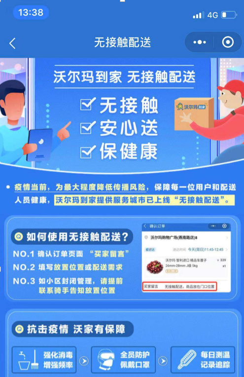 1、下單時(shí)備注選擇“無接觸配送服務(wù)”,盡量避免面對面接觸。