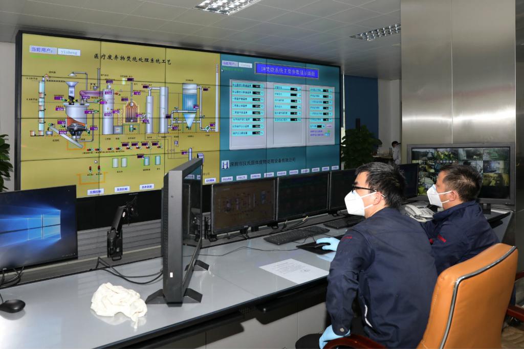 ▲工作人員通過實時影像監(jiān)測醫(yī)療廢物處置過程。