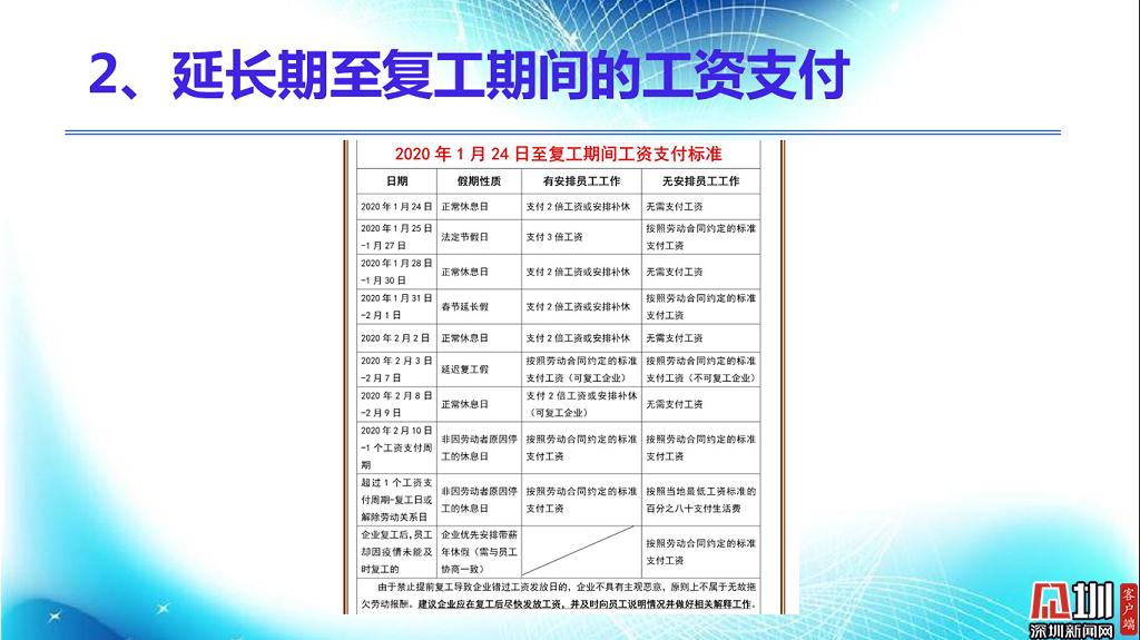 延長期至復(fù)工期間的工資支付問題。延期提前開工,足額支付、加班雙倍;延期正常開工,遵循法規(guī)、正常出勤;開工停工停業(yè),首月按照勞動(dòng)合同規(guī)定正常支付,次月遵法即可;在家網(wǎng)上開工,工資照常應(yīng)照常發(fā)放;開工不足機(jī)制,輪崗待崗、假期協(xié)商;遵守當(dāng)?shù)胤ㄒ?guī),因地制宜,和諧有道。