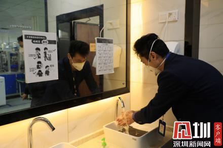 個人衛(wèi)生防護方面,餐廳洗手池、衛(wèi)生間都擺放了消毒洗手液,并張貼著“洗手七步標準法”,指導員工正確洗手。