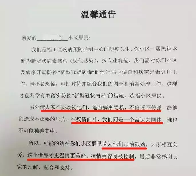 “疫情面前,我們同是一個命運(yùn)共同體”“大家相互關(guān)愛,這個世界才更溫情美好,疫情更容易被控制……”1月30日,位于深圳福田區(qū)的一小區(qū)出現(xiàn)新冠肺炎疑似感染病例,福田區(qū)疾病預(yù)防控制中心的防疫醫(yī)生隨即發(fā)布了這則通告,瞬間刷屏了深圳人的朋友圈。通告除了呼吁小區(qū)居民配合調(diào)查及消毒處理工作外,還特地懇請大家“不要歧視,在疫情面前,我們是同一個命運(yùn)共同體,誰也不可能獨(dú)善其身?!绷攘葦?shù)字的“請求”,感動無數(shù)人。