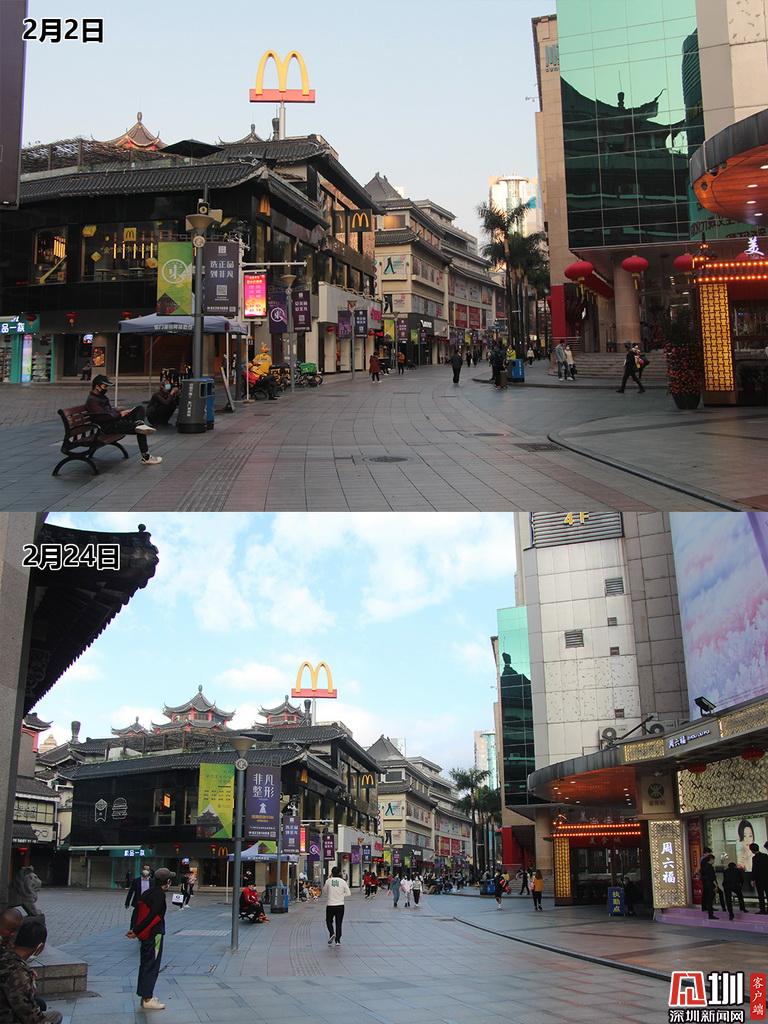 上圖為2月2日,在東門(mén)步行街人煙稀少,下圖為2月24日,東門(mén)步行街進(jìn)入復(fù)工第一天,營(yíng)業(yè)的店面開(kāi)始增多。