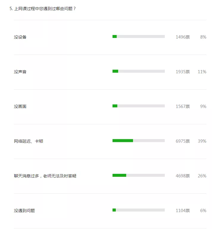 此外,22%的參與者認(rèn)為,網(wǎng)課缺乏教學(xué)氛圍,無(wú)法真正實(shí)現(xiàn)互動(dòng)式在線(xiàn)課堂。有家長(zhǎng)認(rèn)為,目前老師用群進(jìn)行講解,聊天消息過(guò)多,信息雜亂,老師無(wú)法及時(shí)答疑,建議老師通過(guò)小視頻等形式將熱點(diǎn)問(wèn)題再進(jìn)行補(bǔ)充講解。