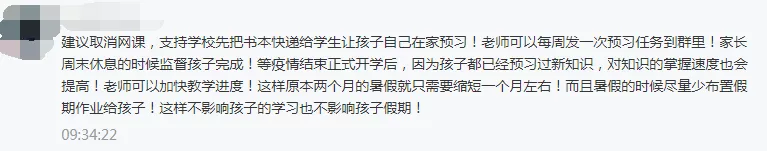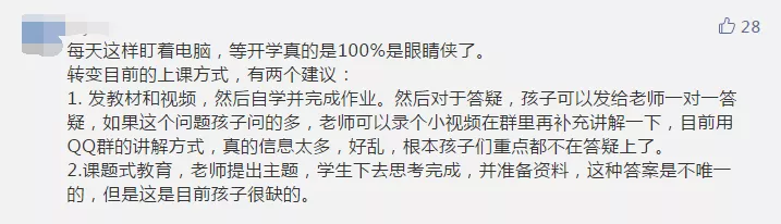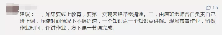 在疫情期間,如何做好“停課不停學(xué)”,許多參與者也給出自己的建議。有家長(zhǎng)建議將目前的上課形式轉(zhuǎn)變?yōu)椤罢n題式教育”,即由老師出主題,學(xué)生獨(dú)立思考完成。