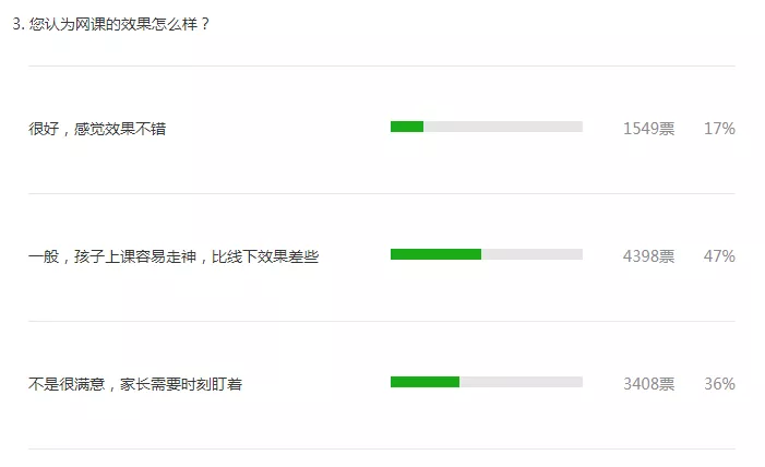 網(wǎng)課的效果到底如何?根據(jù)深圳新聞網(wǎng)的調(diào)查,64%的參與者對(duì)網(wǎng)課效果感到“滿(mǎn)意”或“一般”。多數(shù)參與者認(rèn)為“孩子容易走神”或“需要家長(zhǎng)時(shí)刻監(jiān)管”。在低年級(jí)孩子“難以集中注意力”這一問(wèn)題在留言里尤為突顯。