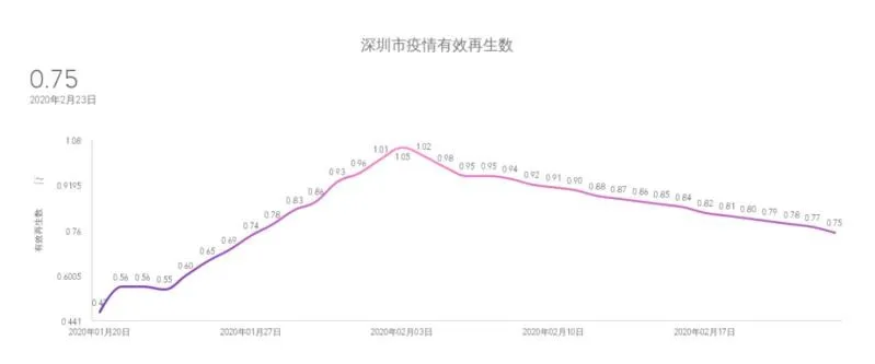 最后,考慮新冠肺炎的有效再生數(shù)。有效再生數(shù),即有效感染數(shù),指一個患病者平均可以感染健康者的人數(shù)。當(dāng)有效再生數(shù)下降到1以內(nèi)時,可以認為疫情就已經(jīng)得到了很好的控制并將逐漸消失。以全國第一例確診患者的報道時間為疫情開始時間,計算出深圳市疫情有效再生數(shù),可以看到有效再生數(shù)在經(jīng)過一段時間上升后,在2月3日附近出現(xiàn)拐點,2月3日之后處于逐漸下降水平,2月23日已從峰值的1.05下降到了0.75,說明針對疫情的一系列防控措施取得了很好的效果。