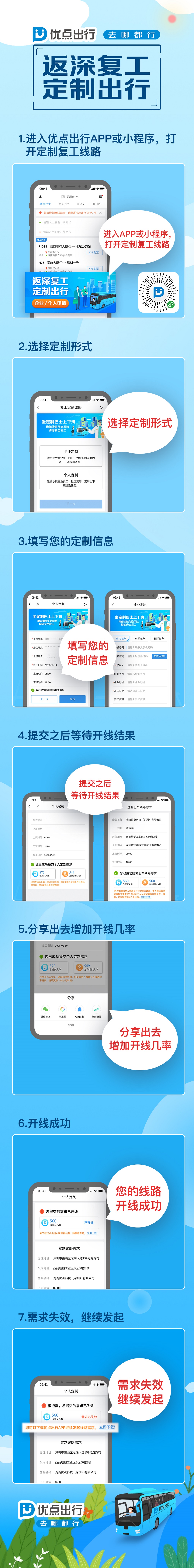 復(fù)工企業(yè)和個(gè)人在“優(yōu)點(diǎn)出行”APP或“優(yōu)點(diǎn)巴士”小程序中提交申請(qǐng)、填寫(xiě)復(fù)工出行需求,由優(yōu)點(diǎn)出行平臺(tái)聚合生成復(fù)工專線并通知乘客,深圳巴士集團(tuán)提供安全消毒的車輛進(jìn)行乘客運(yùn)輸。