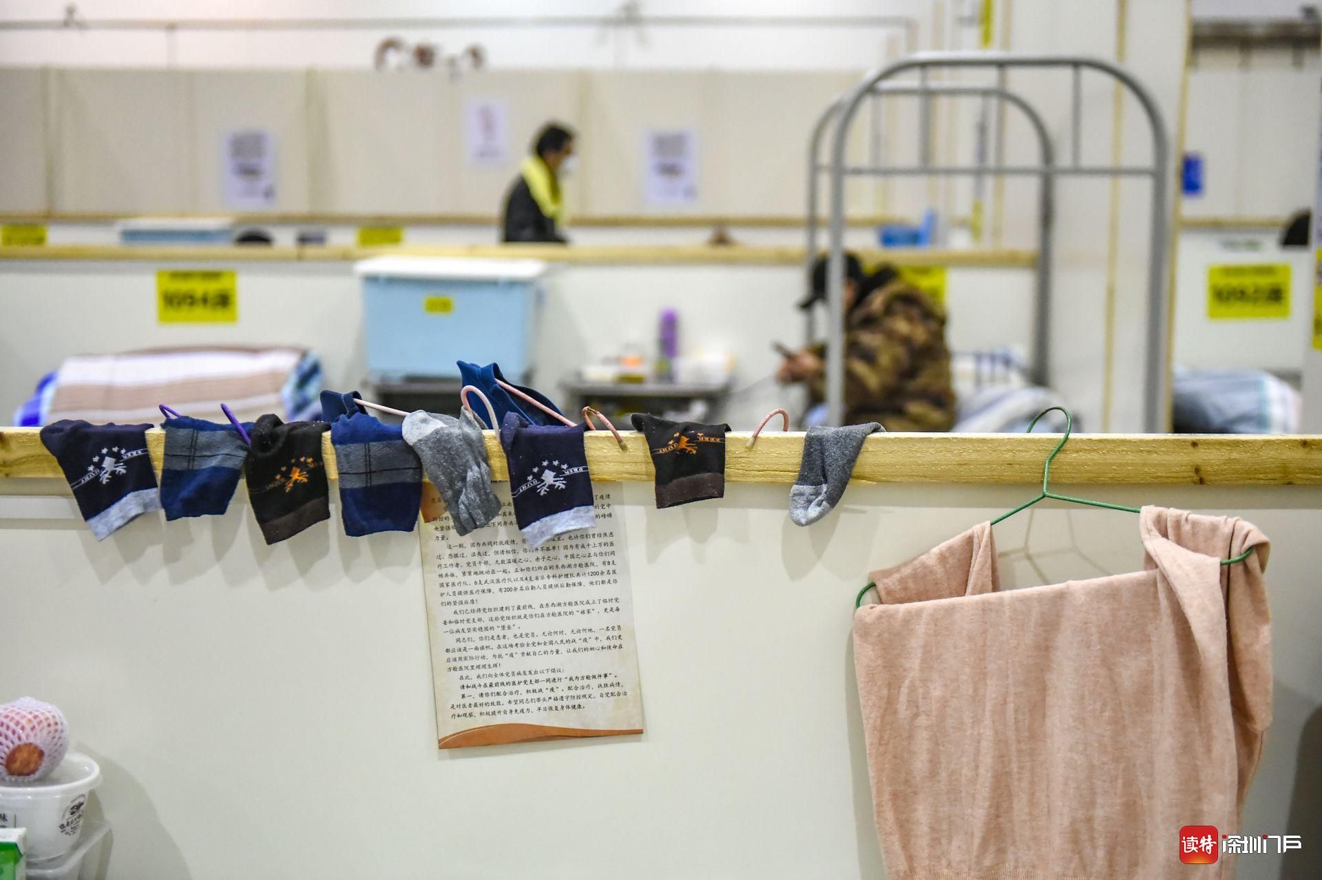 客廳方艙醫(yī)院里面擺放了上下鋪高低床,病人住在下鋪,上面擺放生活用品。