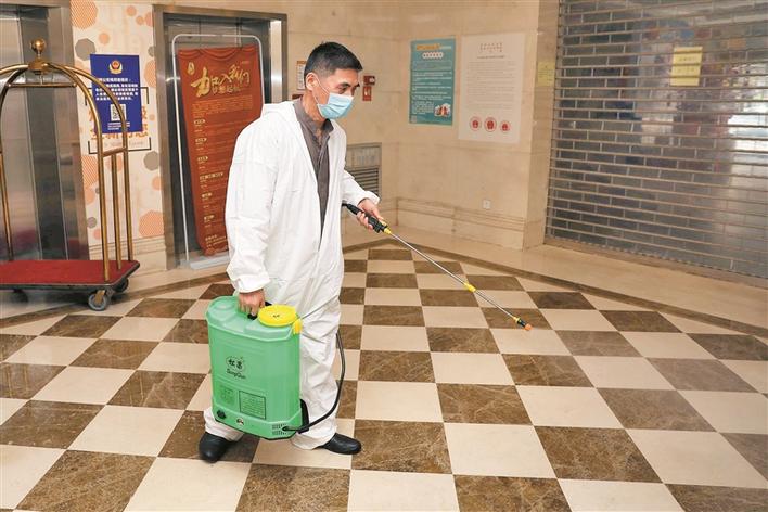 ▲工作人員對酒店大堂進行消毒。深圳晚報記者楊少昆攝