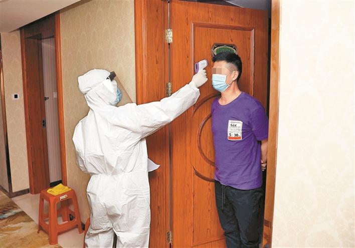 ▲醫(yī)務人員為醫(yī)學觀察人員測量體溫。深圳晚報記者楊少昆攝