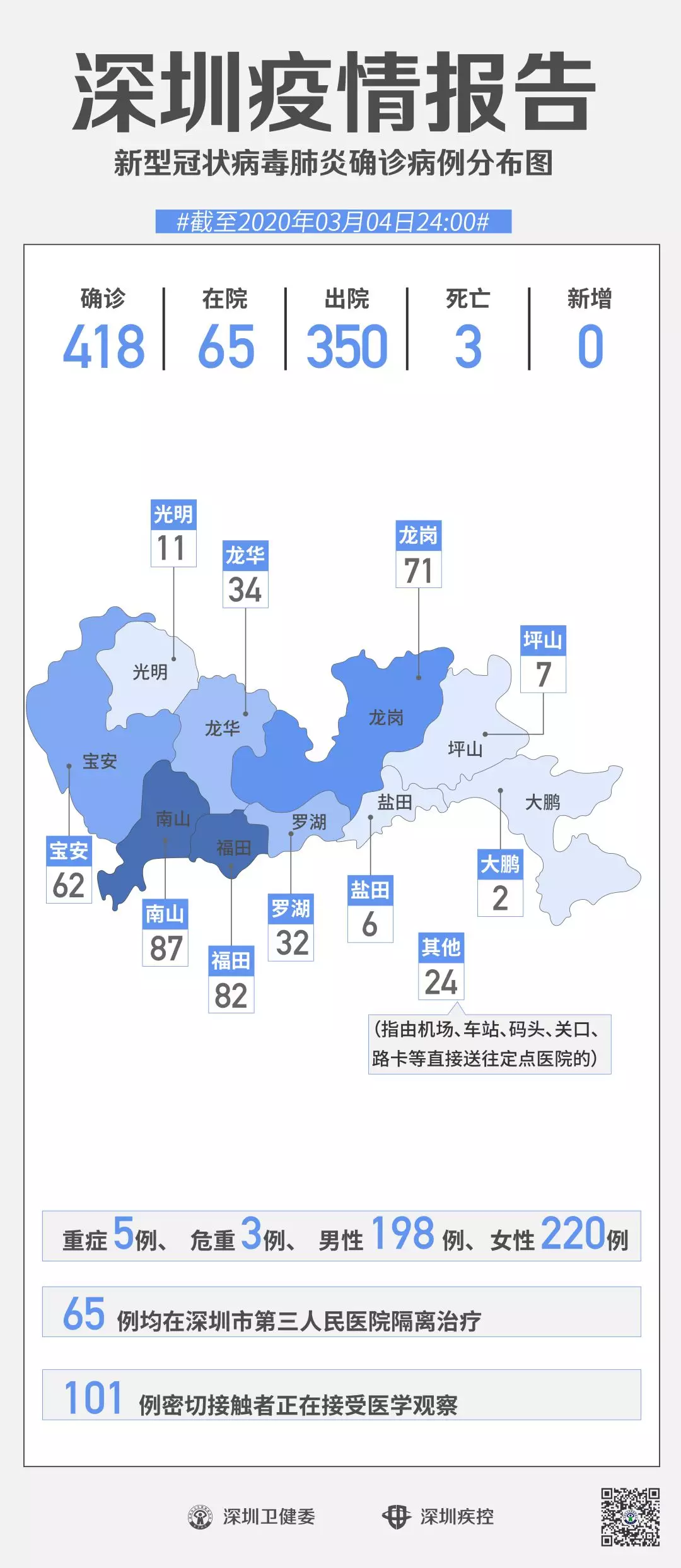 按照病例管理地區(qū)劃分,南山區(qū)87例、福田區(qū)82例、龍崗區(qū)71例、寶安區(qū)62例、龍華區(qū)34例、羅湖區(qū)32例、光明區(qū)11例、坪山區(qū)7例、鹽田區(qū)6例、大鵬新區(qū)2例、其他(指由機場、車站、碼頭、關口、路卡等直接送往定點醫(yī)院的)24例。