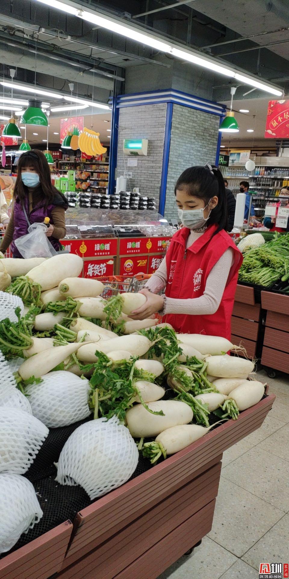 隨著疫情發(fā)生,春節(jié)期間待在深圳的露茜隨媽媽投身到了防疫一線,從事食品藥品安全志愿服務(wù)工作。在商場(chǎng)維持秩序,為市民挑揀蔬菜,成為了顧客眼中“別人家的孩子”。