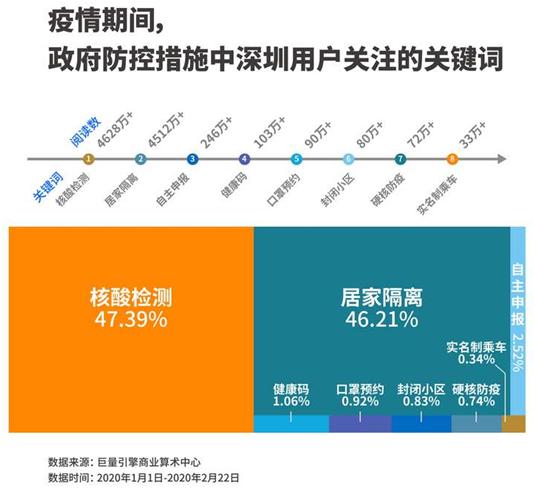 深圳市的具體防控舉措也被今日頭條深圳區(qū)域用戶高頻關(guān)注。數(shù)據(jù)顯示,免費(fèi)的核酸檢測關(guān)注度排名第一,閱讀數(shù)達(dá)到4628萬次。為了防范病毒的社區(qū)傳播,2月12日起,深圳市對于居家隔離觀察人員全面展開了病毒免費(fèi)合作檢測工作。隔離者的確定集合了街道的逐戶排查和住戶的自主申報,結(jié)合住戶的行程軌跡,最大程度避免遺漏。