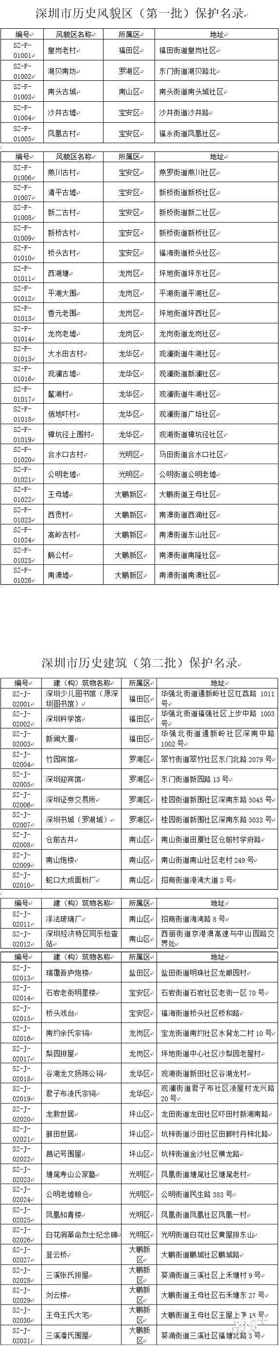 第一批深圳市歷史風(fēng)貌區(qū)中,寶安區(qū)7個,龍華區(qū)5個,大鵬新區(qū)5個,龍崗區(qū)有4個,光明區(qū)2個,福田、羅湖、南山和各有1個。