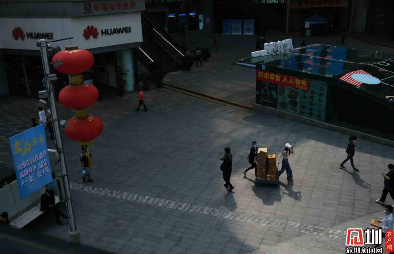 華強(qiáng)北步行街上的非接觸物流快遞區(qū)。