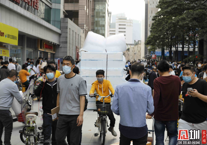 3月16日,華強(qiáng)北步行街上,人流量明顯增多,兩位推著平板車運(yùn)送貨物的人走過(guò)。