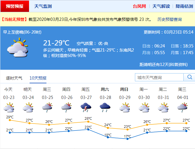 見圳客戶端·深圳新聞網(wǎng)2020年3月22日訊 深圳今天多云間晴天,早晚有輕霧;氣溫21-29℃;東南風(fēng)2級(jí);相對(duì)濕度60%-95%。