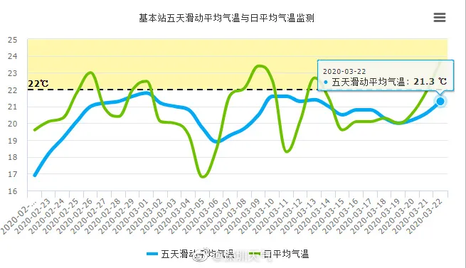 以5天滑動平均氣溫穩(wěn)定>22 ℃ 為春季結(jié)束、夏季開始,看圖一中的藍(lán)色曲線(五天滑動平均氣溫)已經(jīng)在抬頭了,能不突破虛線還得看接下來幾天的氣溫。