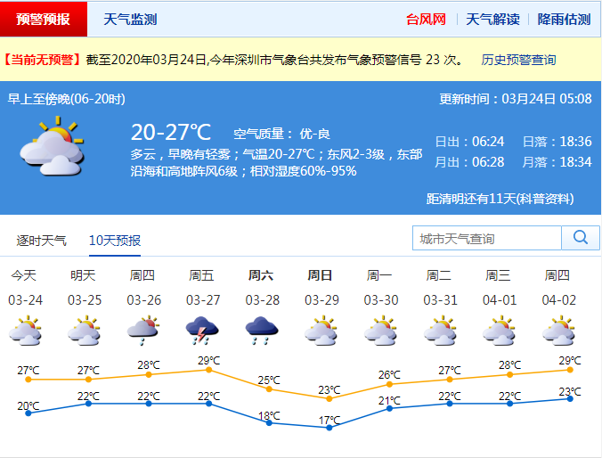 見(jiàn)圳客戶端·深圳新聞網(wǎng)2020年3月23日訊 深圳今天多云,早晚有輕霧;氣溫20-27℃;東風(fēng)2-3級(jí),東部沿海和高地陣風(fēng)6級(jí);相對(duì)濕度60%-95%。
