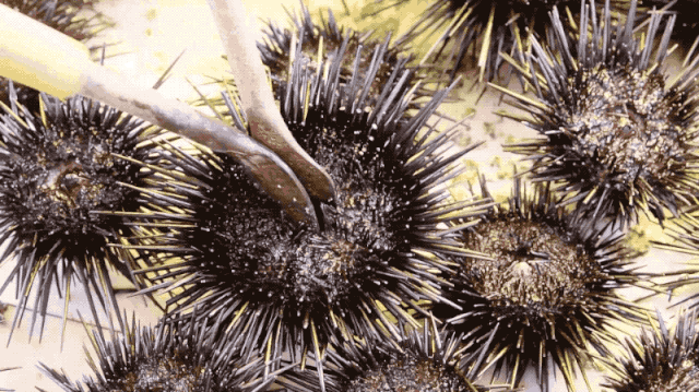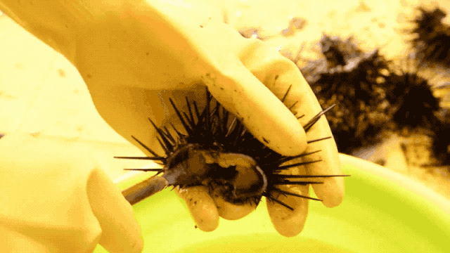 記者來到大鵬新區(qū)南澳海港路的潤成海膽專賣店,看到工人們上下飛舞著鐵鉤“挖海膽”。南澳本地人口中所謂“挖海膽”就是海膽加工,打開海膽殼,把海膽肉取出來,然后用海水清洗干凈。從捕撈到上岸加工處理都必須一天之內(nèi)完成,只有嚴(yán)守時間的把控,爭分奪秒才配擁有鮮美和誘人的口感。