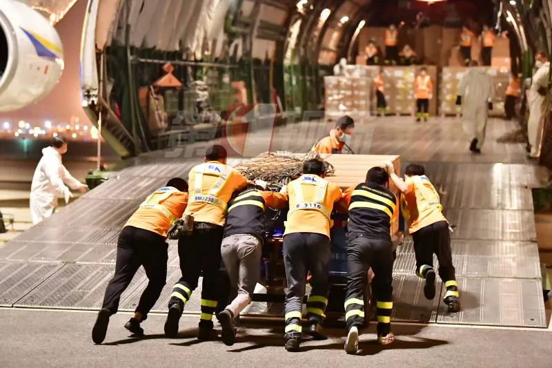 3月23日晚上,在深圳機場389機位,機場人員喊著口號,用力將裝滿物資的貨卡由機艙口的斜坡推進貨艙。經(jīng)過9個小時的忙碌,終于將裝滿110個貨卡、29塊大貨板的防疫物資全部裝上了這架空中“巨無霸”,近70噸防疫物資從深圳運往捷克首都布拉格。