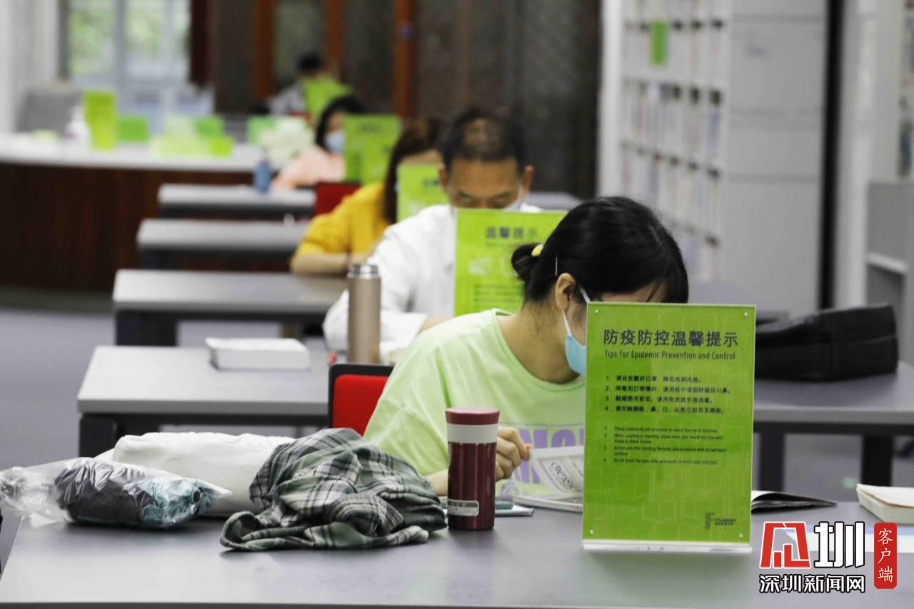 現(xiàn)在正處疫情期間,福田區(qū)圖書(shū)館也調(diào)整了開(kāi)放時(shí)間,從原來(lái)的朝九晚九,改為朝九晚五。在座位安排方面,記者在現(xiàn)場(chǎng)看到,自習(xí)的市民基本上都是單人單桌,保持安全距離。