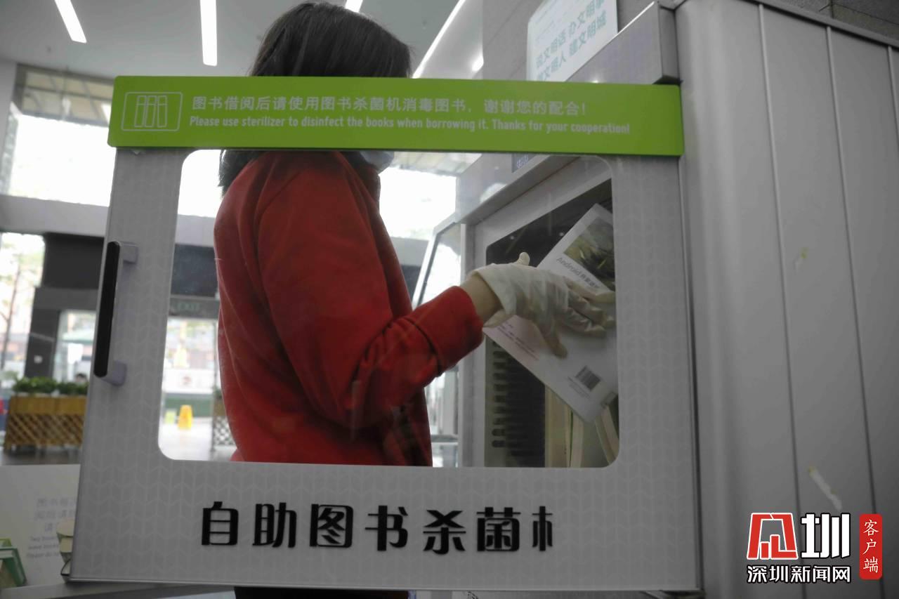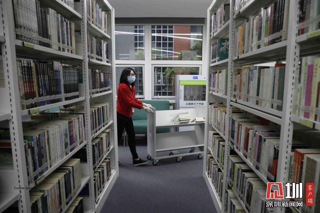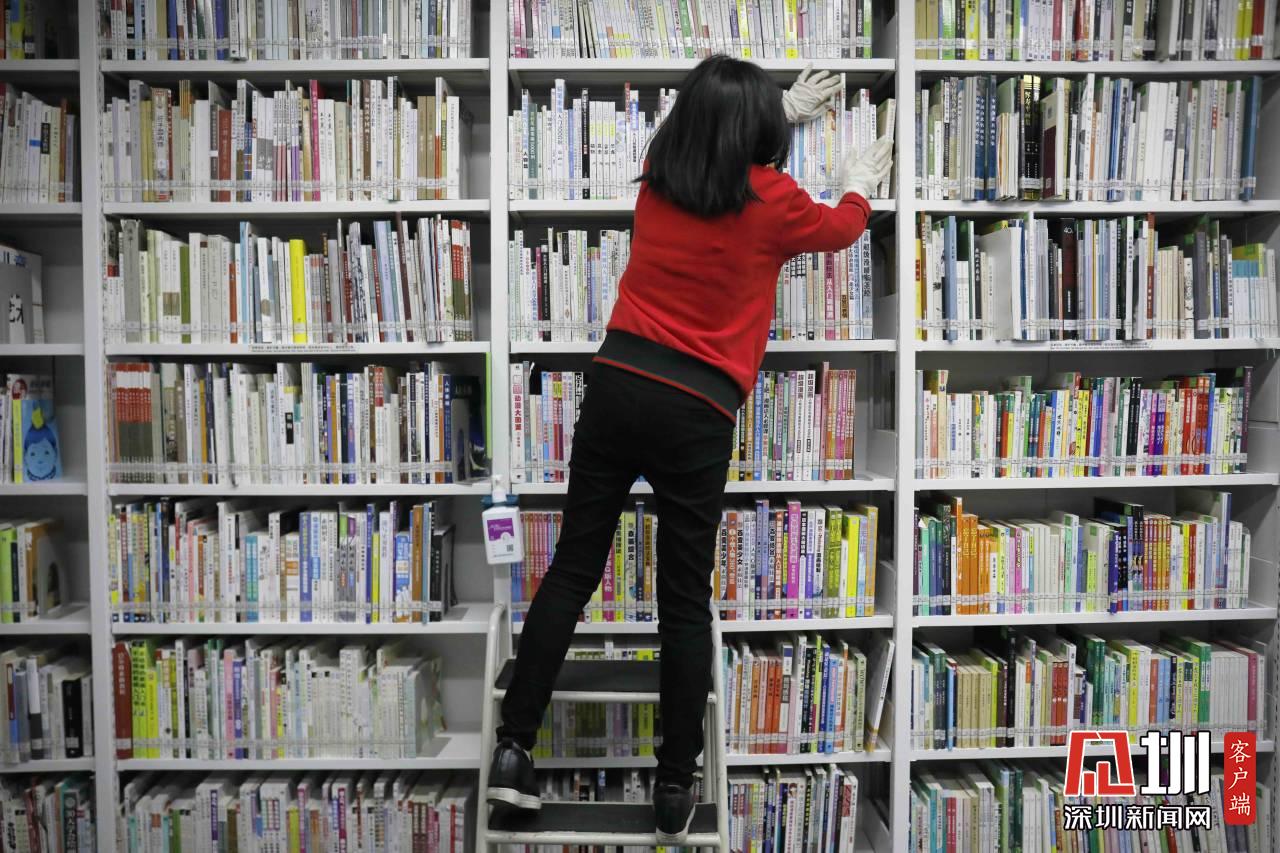 工作人員正在對(duì)福田圖書(shū)館的書(shū)做消毒處理。