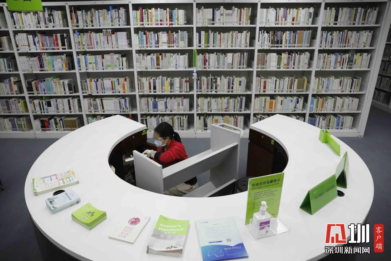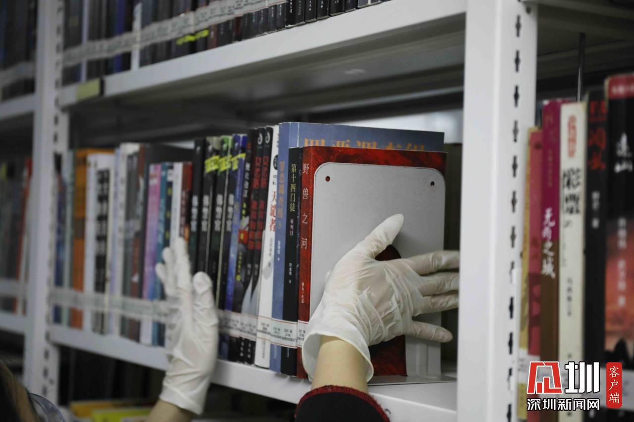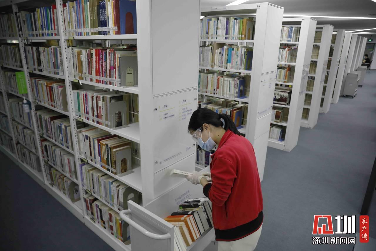 工作人員正在對(duì)福田圖書(shū)館的書(shū)做消毒處理。