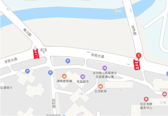 紅色畫筆標示的地方,即為學苑大道上設(shè)計不合理的斑馬線。