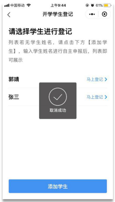對(duì)于已完成開學(xué)登記的師生,如開學(xué)登記頁面顯示學(xué)校信息或班級(jí)信息已失效,或選錯(cuò)登記人員時(shí),請(qǐng)取消此條登記記錄,重新進(jìn)行開學(xué)登記。取消成功后,原申報(bào)的師生健康卡信息將會(huì)失效。以下操作步驟以學(xué)生登記為例,具體如下: