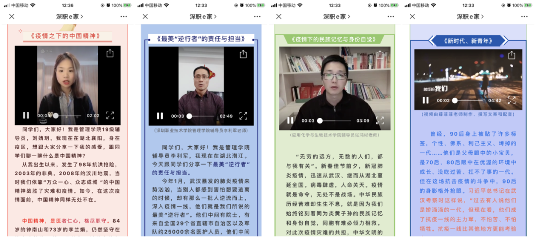 深圳職業(yè)技術(shù)學(xué)院學(xué)生工作部組織33位青年輔導(dǎo)員,推出33講戰(zhàn)“疫情”系列微課程,每天8:30準(zhǔn)時(shí)推送。微課程主題涵蓋愛(ài)國(guó)主義教育、理想信念教育、生命教育、社會(huì)責(zé)任感教育、感恩教育,不同的主題、不同的視頻、不同的感悟,輔導(dǎo)員老師和同學(xué)們一起在戰(zhàn)“疫”中成長(zhǎng),為同學(xué)們講述每一個(gè)戰(zhàn)“疫”的感人故事。建環(huán)學(xué)院輔導(dǎo)員薛菲菲老師制作精美短視頻、撰寫(xiě)文案、配樂(lè)、配音,以有思想又有溫度的方式與學(xué)生對(duì)話。她說(shuō),磨煉是成長(zhǎng)的催化劑,抗疫是時(shí)代給予的成人禮,經(jīng)此一役,中國(guó)的年輕人們對(duì)責(zé)任和奉獻(xiàn)的感受更加直觀,對(duì)勇敢和擔(dān)當(dāng)?shù)睦斫飧由羁?,而中?guó),也因?yàn)?0后,收獲了青春洋溢的蓬勃力量!