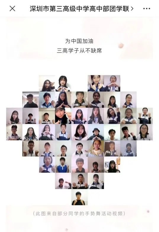 深圳市第三高級(jí)中學(xué)團(tuán)委的龐聰老師和同學(xué)們一起錄制了手勢(shì)舞《不放棄》,為抗疫一線吶喊加油!活動(dòng)先由龐聰老師和團(tuán)委學(xué)生聯(lián)合會(huì)的同學(xué)們策劃、學(xué)習(xí)、錄制、剪輯、審核,共同制作第一支手勢(shì)舞視頻。2月22日,他們?cè)诰W(wǎng)上發(fā)起手勢(shì)舞接力,收到上百名師生發(fā)來(lái)的接力視頻,經(jīng)過(guò)校團(tuán)委匯總、剪輯、發(fā)布,引起強(qiáng)烈的社會(huì)反響。龐老師說(shuō):“疫情無(wú)情,人間有愛(ài),正是疫情讓我們緊緊地依靠在一起,手勢(shì)舞應(yīng)援雖不隆重盛大,但卻也凝結(jié)了我們師生對(duì)于疫情重地武漢的鼓勵(lì)與支持,對(duì)一線醫(yī)療工作者的無(wú)私奉獻(xiàn)的感謝?!?/p>