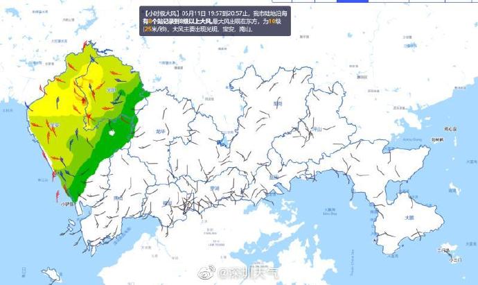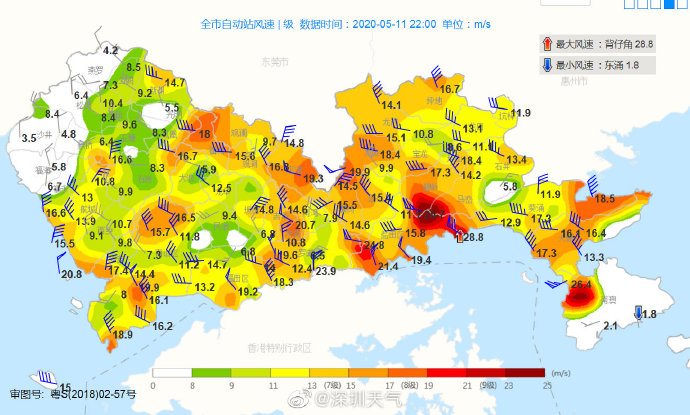 22時18分:過去1小時深圳市最大陣風達到10-11級,出現(xiàn)在鹽田和大鵬南澳地區(qū)。