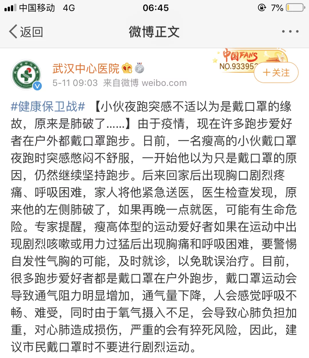 深圳連續(xù)11天零新增!武漢26歲小伙戴口罩跑步突感不適,竟然肺破了!