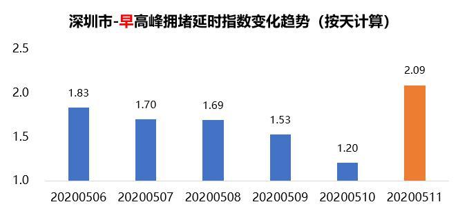 此外,隨著廣州和深圳部分年級開學(xué)復(fù)課,疊加通勤出行需求,統(tǒng)計(jì)數(shù)據(jù)顯示,5月11日廣深兩市均迎來最堵早高峰,其中8:00-9:00時段擁堵程度最高,早高峰擁堵延時指數(shù)分別為1.9和2.09。而晚高峰方面,從5月6日至5月11日數(shù)據(jù)來看,廣州和深圳在5月8日的擁堵程度最高,晚高峰擁堵延時指數(shù)分別為2.10和2.00。