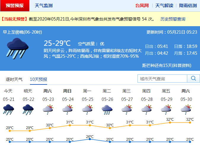 市氣象局預(yù)計(jì),21日凌晨到22日早晨深圳市有暴雨局部大暴雨,并伴有雷暴和8級(jí)左右短時(shí)大風(fēng),強(qiáng)降水主要影響時(shí)段在21日午后至22日早晨;22日白天降水減弱,23日轉(zhuǎn)(雷)陣雨天氣。