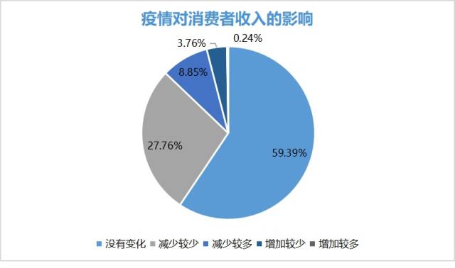 第一,疫情導致部分消費者收入減少。調(diào)研發(fā)現(xiàn),1012位受訪者中收入沒有變化的占比59.39%,受疫情影響收入減少的受訪者占比為36.61%,收入增加的人數(shù)僅4%。