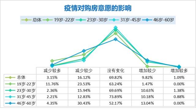 通過對不同年齡段消費者的購房、購車意愿調(diào)研發(fā)現(xiàn),19-22歲及46-60歲的受訪者因疫情影響購房、購車意愿變化相對較大,意愿減少人數(shù)占比較多。