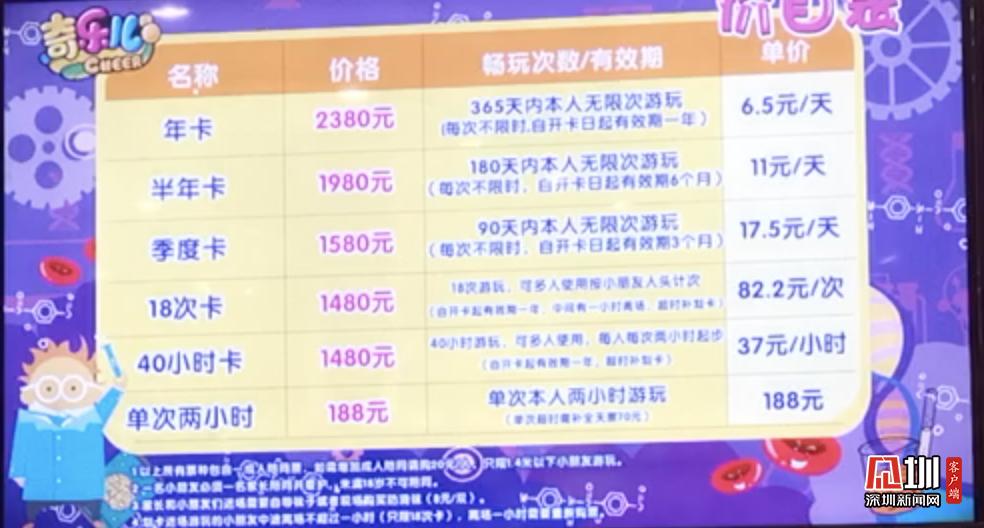 星際傳奇采用多場(chǎng)所差異化的收費(fèi)制度,每個(gè)項(xiàng)目?jī)r(jià)格均有不同,深圳新聞網(wǎng)記者從工作人員處了解到每位兒童的單次消費(fèi)均價(jià)在150元左右,陪同的大人免費(fèi)。有需要的市民也可以選擇辦理月卡或者是年卡,享受更大力度的折扣。游樂(lè)場(chǎng)內(nèi)部地面干凈整潔,有家長(zhǎng)休息區(qū),在前臺(tái)有充電寶租借。