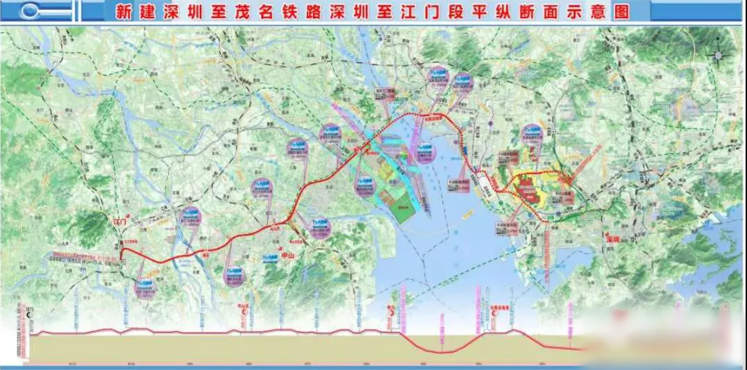 新建鐵路深圳至茂名鐵路深圳至江門段正線從深圳樞紐西麗站(規(guī)劃)引出,經(jīng)深圳市、東莞、南沙區(qū),中山、江門,引入深茂鐵路江門至茂名段江門站(在建)。