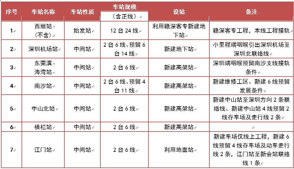 項目共設(shè)西麗(不含)、深圳機場、濱海灣、南沙、中山北、橫欄、江門等7個車站,其中西麗、深圳機場為地下站,濱海灣、南沙、中山北、橫欄為高架站,江門站為地面站。