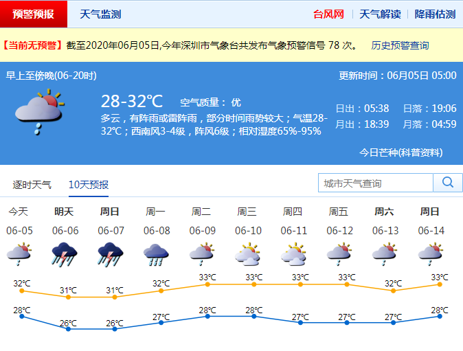市氣象臺(tái)綜合預(yù)測,深圳5日有陣雨或雷陣雨,部分時(shí)間雨勢較大;6日~8日有一次暴雨,局部大暴雨降雨過程,并伴有雷暴和8級(jí)左右短時(shí)大風(fēng);強(qiáng)降雨主要出現(xiàn)在6日凌晨至上午和7日凌晨至上午;8日午后降雨減弱。此外,降雨具有突發(fā)性明顯、短時(shí)雨強(qiáng)、累計(jì)雨量大的特點(diǎn),強(qiáng)降雨易出現(xiàn)在凌晨至上午。